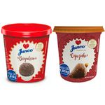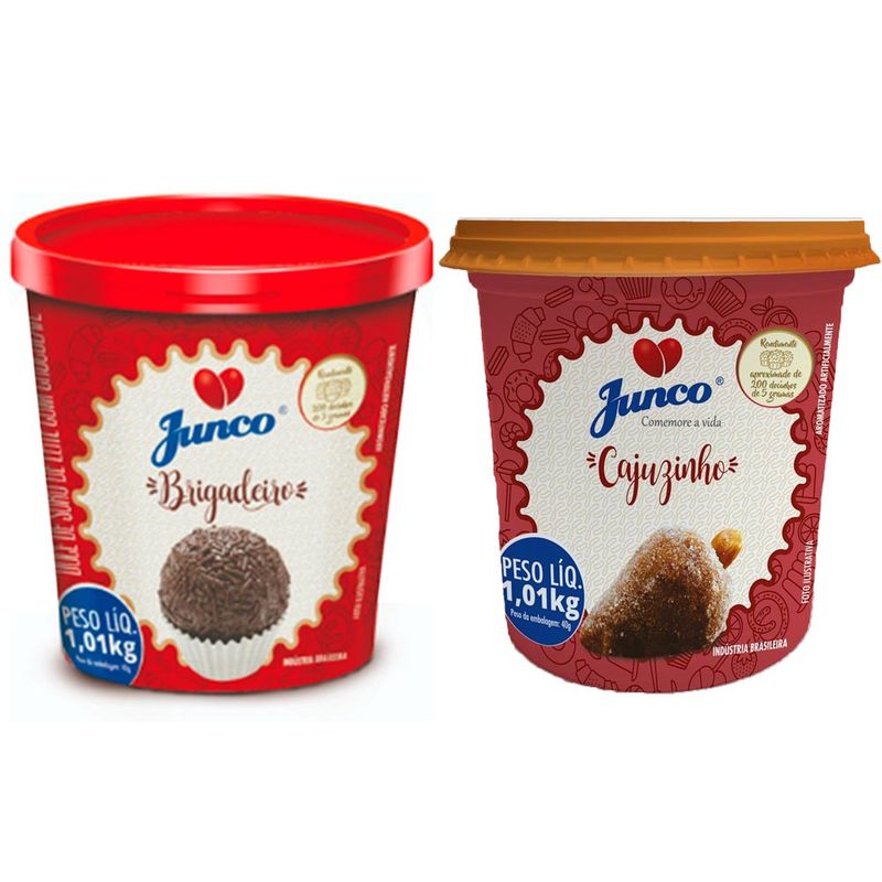 Este kit contém 2 potes de 1,010g dos seguintes sabores: Brigadeiro e Cajuzinho. Todos os produtos JUNCO são confeccionados com matérias primas de alta qualidade, utilizando materiais adequados e tintas atóxicas no processo de impressão, observando a conformidade com todos os padrões do INMETRO. Como resultado você leva para sua casa produtos de ótima qualidade e segurança para você e sua família utilizarem à vontade.Cada pote de 1,010g tem rendimento aproximado de 200 unidades de 5g cada, que corresponde a forminha número 6. Para conservação, mantenha em local seco e arejado. Após aberto conservar no refrigerador em temperatura até 10ºC e consumir, no máximo, em 15 dias ou em temperatura ambiente até 7 dias. Ingredientes do Brigadeiro: Soro de leite refrigerado e/ou soro de leite em pó reconstituído, açúcar, amido, leite cru refrigerado e ou leite em pó integral reconstituído, pó de cacau alcalino, concentrado proteico de soro em pó, espessante pectina (INS 440), conservante sorbato de potássio (INS 202), aroma artificial de leite em pó, estabilizante citrato de sódio (INS 331iii) e aroma artificial de baunilha. Não contém glúten. Contém lactose. Alérgicos: Contém leite e derivados. Pode conter amendoim e canela. Ingredientes do Cajuzinho: Soro de leite refrigerado e/ou soro de leite em pó, açúcar, leite cru integral e ou leite em pó integral, amido modificado, farinha de amendoim, espessante pectina (INS 440), pó de cacau alcalino, conservante sorbato de potássio (INS 202), aroma artificial de leite em pó e estabilizante citrato de sódio (INS 331iii). Não contém glúten. Contém lactose. Alérgicos: Contém leite e derivados. Pode conter amendoim e canela.