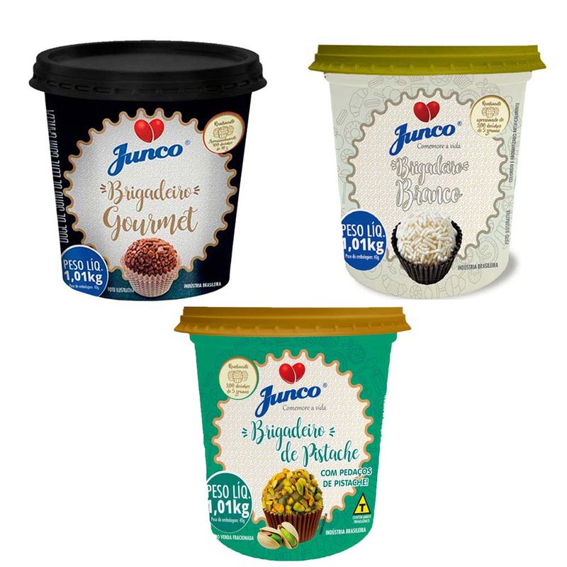 Este kit contém 3 potes de 1,010g dos seguintes sabores: Brigadeiro Gourmet, Brig Branco e Pistache. Todos os produtos JUNCO são confeccionados com matérias primas de alta qualidade, utilizando materiais adequados e tintas atóxicas no processo de impressão, observando a conformidade com todos os padrões do INMETRO. Como resultado você leva para sua casa produtos de ótima qualidade e segurança para você e sua família utilizarem à vontade.Cada pote de 1,010g tem rendimento aproximado de 200 unidades de 5g cada, que corresponde a forminha número 6. Para conservação, mantenha em local seco e arejado. Após aberto conservar no refrigerador em temperatura até 10ºC e consumir, no máximo, em 15 dias ou em temperatura ambiente até 7 dias. Ingredientes do Brigadeiro Gourmet: Soro de leite refrigerado e/ou soro de leite em pó reconstituído, leite refrigerado e/ou leite em pó integral reconstituído, açúcar, amido modificado, água, pó de cacau alcalino, chocolate em pó 50%, concentrado proteico de soro em pó, pectina (INS 440), sorbato de potássio (INS 202), aroma artificial de leite em pó e citrato de sódio (INS 331iii). Não contém glúten. Contém lactose. Alérgicos: Contém leite e derivados. Pode conter amendoim e canela. Ingredientes do Brig Branco: Soro de leite refrigerado e/ou soro de leite em pó reconstituído, açúcar, leite fluído á granel de uso industrial e/ou leite em pó integral reconstituído, amido modificado, água, concentrado proteico de soro de leite em pó, espessante pectina (INS 440), aroma idêntico ao natural de chocolate branco, conservante sorbato de potássio (INS 202), aroma idêntico ao natural de leite, estabilizante citrato de sódio (INS 331ii) e corante dióxido de titânio (INS 171). Ingredientes do Pistache: Soro de leite refrigerado e/ou soro de leite em pó reconstituído, açúcar, leite fluido a granel de uso industrial e/ou leite em pó integral reconstituído, amido modificado, água, farinha de castanha de caju, pistache triturado, pasta de pistache, concentrado proteico de soro de leite em pó, espessante pectina (INS 440), aroma idêntico ao natural de leite, aroma idêntico ao natural de pistache, conservante sorbato de potássio (INS 202), estabilizante citrato de sódio(INS 331iii) corantes de óxido de titânio (INSS 171), amarelo tartrazina (INSS 102), indigotina (INSS 132). Alérgicos: Contém leite e derivados, castanha de Caju e pistache. Pode conter amendoim e avelã. Contém lactose. Não contém glúten.