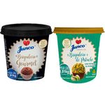 Este kit contém 2 potes de 1,010g dos seguintes sabores: Brigadeiro Gourmet e Pistache. Todos os produtos JUNCO são confeccionados com matérias primas de alta qualidade, utilizando materiais adequados e tintas atóxicas no processo de impressão, observando a conformidade com todos os padrões do INMETRO. Como resultado você leva para sua casa produtos de ótima qualidade e segurança para você e sua família utilizarem à vontade.Cada pote de 1,010g tem rendimento aproximado de 200 unidades de 5g cada, que corresponde a forminha número 6. Para conservação, mantenha em local seco e arejado. Após aberto conservar no refrigerador em temperatura até 10ºC e consumir, no máximo, em 15 dias ou em temperatura ambiente até 7 dias. Ingredientes do Brigadeiro Gourmet: Soro de leite refrigerado e/ou soro de leite em pó reconstituído, leite refrigerado e/ou leite em pó integral reconstituído, açúcar, amido modificado, água, pó de cacau alcalino, chocolate em pó 50%, concentrado proteico de soro em pó, pectina (INS 440), sorbato de potássio (INS 202), aroma artificial de leite em pó e citrato de sódio (INS 331iii). Não contém glúten. Contém lactose. Alérgicos: Contém leite e derivados. Pode conter amendoim e canela. Ingredientes do Pistache: Soro de leite refrigerado e/ou soro de leite em pó reconstituído, açúcar, leite fluido a granel de uso industrial e/ou leite em pó integral reconstituído, amido modificado, água, farinha de castanha de caju, pistache triturado, pasta de pistache, concentrado proteico de soro de leite em pó, espessante pectina (INS 440), aroma idêntico ao natural de leite, aroma idêntico ao natural de pistache, conservante sorbato de potássio (INS 202), estabilizante citrato de sódio(INS 331iii) corantes de óxido de titânio (INSS 171), amarelo tartrazina (INSS 102), indigotina (INSS 132). Alérgicos: Contém leite e derivados, castanha de Caju e pistache. Pode conter amendoim e avelã. Contém lactose. Não contém glúten.