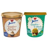 Este kit contém 2 potes de 1,010g dos seguintes sabores: Churros e Pistache. Todos os produtos JUNCO são confeccionados com matérias primas de alta qualidade, utilizando materiais adequados e tintas atóxicas no processo de impressão, observando a conformidade com todos os padrões do INMETRO. Como resultado você leva para sua casa produtos de ótima qualidade e segurança para você e sua família utilizarem à vontade.Cada pote de 1,010g tem rendimento aproximado de 200 unidades de 5g cada, que corresponde a forminha número 6. Para conservação, mantenha em local seco e arejado. Após aberto conservar no refrigerador em temperatura até 10ºC e consumir, no máximo, em 15 dias ou em temperatura ambiente até 7 dias. Ingredientes do Churros: Soro de leite refrigerado e/ou soro de leite em pó, açúcar, leite cru refrigerado e/ou leite em pó integral, amido modificado, espessante pectina (INS 440), conservante sorbato de potássio (INS 202), canela em pó, aroma artificial de leite em pó, estabilizante citrato de sódio (INS 331iii), corante dióxido de titânio (INS 171) e corante idêntico ao natural de caramelo (INS 150c). NÃO CONTÉM GLÚTEN. Alérgicos: Contém leite e derivados. Pode conter amendoim e canela. Contém Lactose. Ingredientes do Pistache: Soro de leite refrigerado e/ou soro de leite em pó reconstituído, açúcar, leite fluido a granel de uso industrial e/ou leite em pó integral reconstituído, amido modificado, água, farinha de castanha de caju, pistache triturado, pasta de pistache, concentrado proteico de soro de leite em pó, espessante pectina (INS 440), aroma idêntico ao natural de leite, aroma idêntico ao natural de pistache, conservante sorbato de potássio (INS 202), estabilizante citrato de sódio(INS 331iii) corantes de óxido de titânio (INSS 171), amarelo tartrazina (INSS 102), indigotina (INSS 132). Alérgicos: Contém leite e derivados, castanha de Caju e pistache. Pode conter amendoim e avelã. Contém lactose. Não contém glúten.