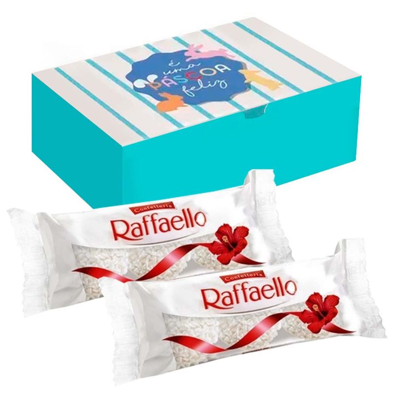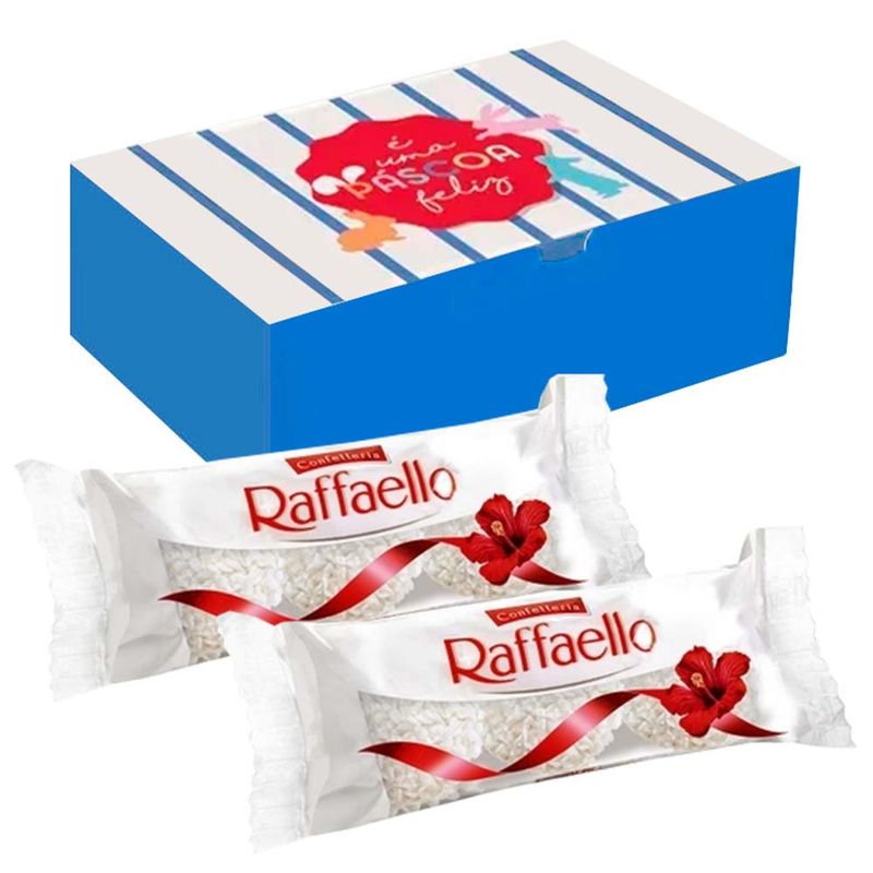 Kit composto por: 1 caixa com estampa de Páscoa sortida + 2 pacotinho com 3 unidades de bombom Raffaello.