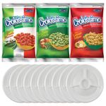 Kit ideal para a sua festa! Kit composto por 10 pratos com divisória, 1 amendoim crokissimo crocante 1,01kg, 1 amendoim crokissimo cebola e salsa 1,01kg e 1 amendoim crokissimo pimenta 1,01kg. Cada prato mede 19cm de diâmetro e possui tampa. Contém quatro divisórias e espaço central para servir os convidados de maneira fácil e rápida!