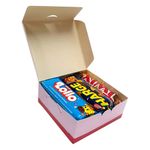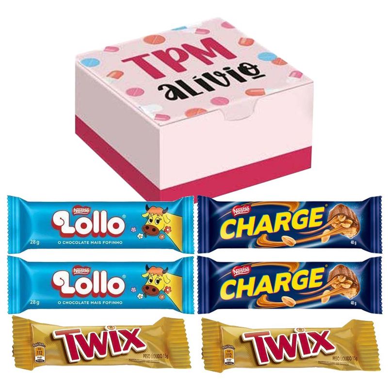Kit composto por: 1 caixa TPM, 2 barrinhas chocolate Lollo 28g, 2 barrinhas chocolate Charge 40g e 2 barrinhas chocolate Twix 15g.