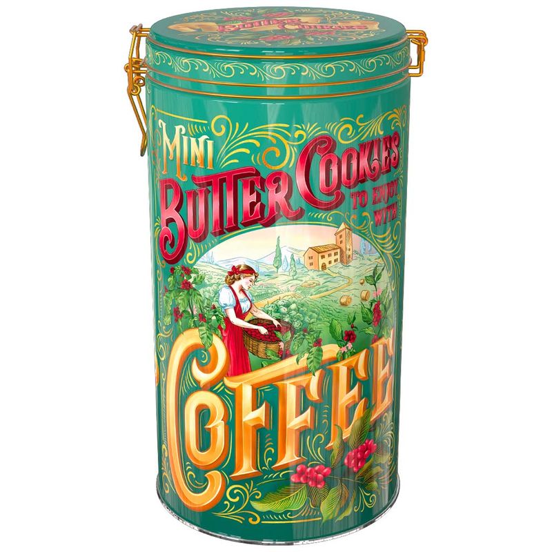 Delicosos biscoitinhos amanteigados e açucarados que derretem na boca! Contém 5 formatos de biscoitos sortidos. Vem numa linda lata com três modelos colecionáveis que podem ser reutilizados para armazenar seus alimentos. Ideal para presentear ou para saborear!