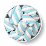 Marshmallow torção nas cores azul e branco e sabor baunilha. Perfeito para decorações de mesas de festa, deixando qualquer decoração única e especial! Pode ser consumido tanto puro, como tostado ou assado, acompanhando bebidas quentes e fondues. Pacote de 250g contendo aproximadamente 50 unidades.