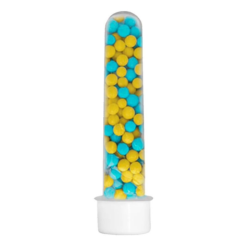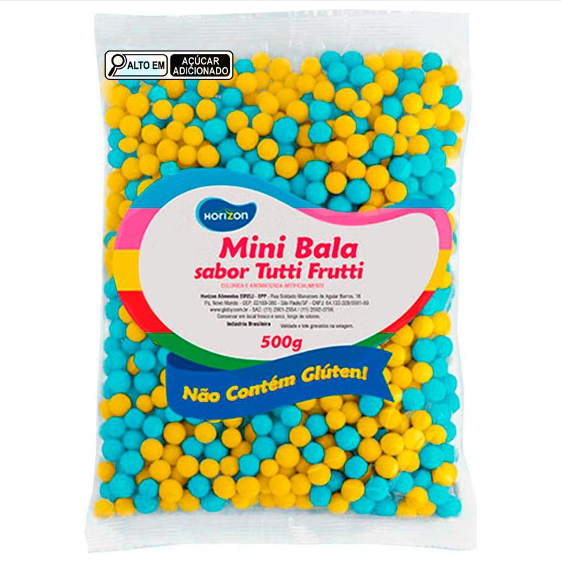 Mini balas confeitadas nas cores azul e amarelo e sabor tutti frutti. Ideal para lembrancinhas e decorações de festas. Embalagem de 500g.