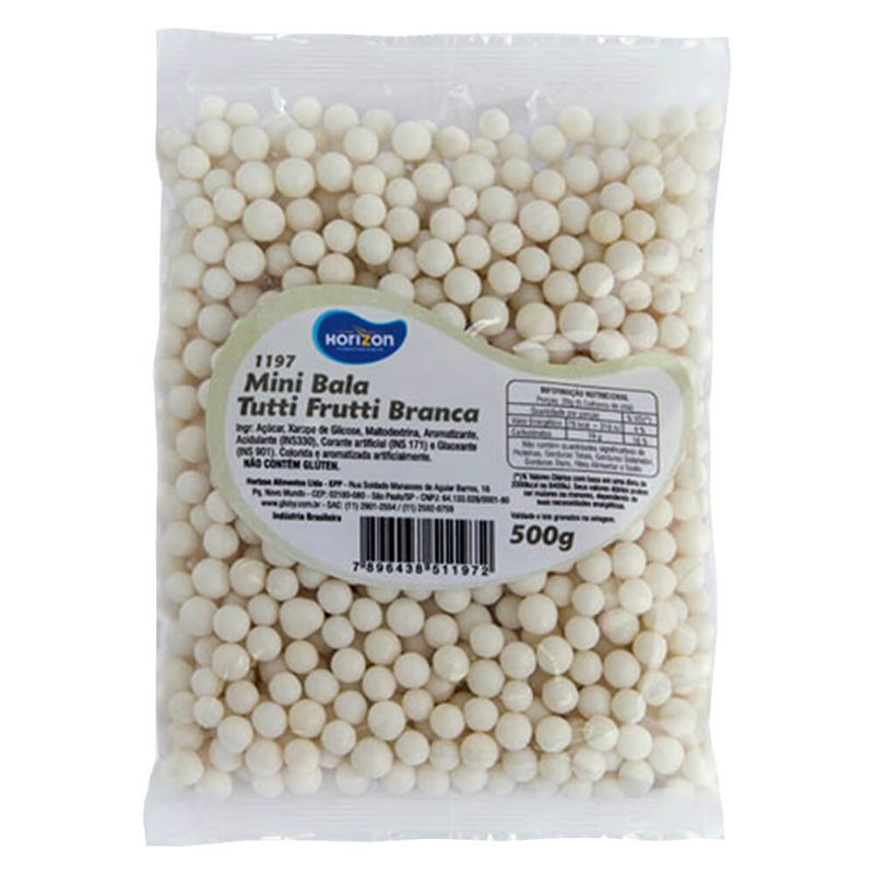 Mini balas confeitadas na cor branca e sabor tutti frutti. Ideal para lembrancinhas e decorações de festas. Embalagem de 500g.