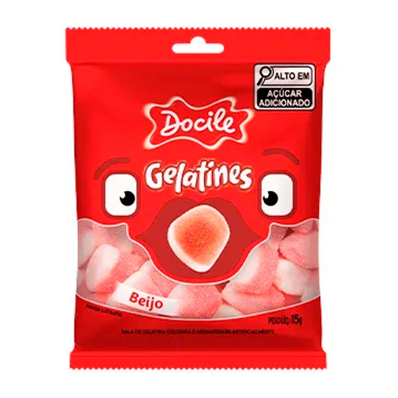 Ingredientes: Xarope de glicose, açúcar, água, gelificantes gelatina e pectina, acidulante ácido cítrico, aromatizantes e corante artificial vermelho 40. NÃO CONTÉM GLÚTEN.