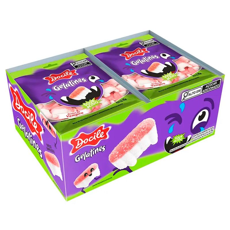 A clássica bala de gelatina Dentes de Vampiro em miniatura, super fofa e saborosa! E ainda por cima, com cobertura azedinha! Cada caixa vem com 12 pacotes de 15g.