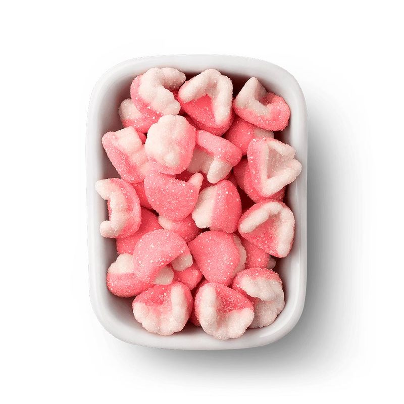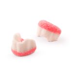 Ingredientes: Xarope de glicose, açúcar, água, gelificante gelatina, acidulantes ácido cítrico e ácido málico, corante inorgânico dióxido de titânio, aromatizante e corante artificial vermelho 40. NÃO CONTÉM GLÚTEN.