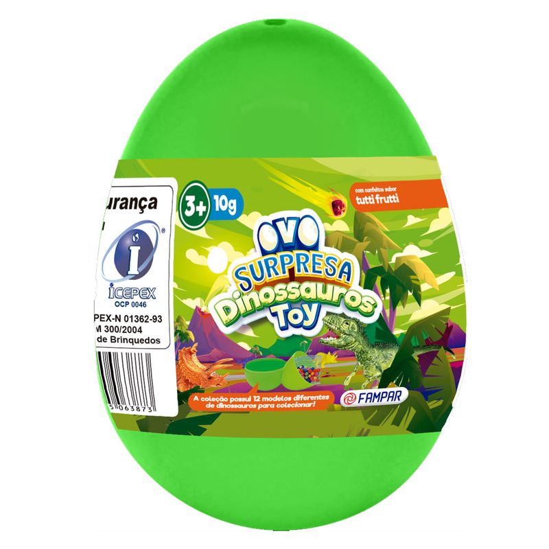 Ovo Surpresa Dinossauros Toy, ovinho surpresa que vem com um dinossauro aleatório e um confeito colorido sabor tutti frutti. São 12 modelos de dinossauros para colecionar e se divertir! Não recomendado para crianças menores de 3 anos.