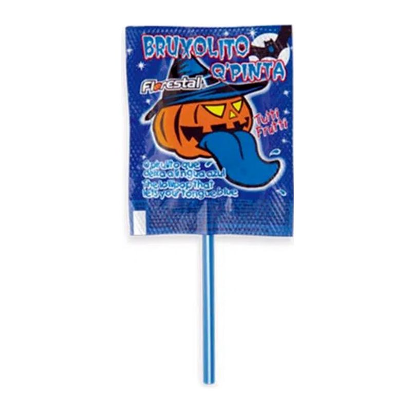 Bruxolito, o pirulito sabor tutti frutti que deixa a lingua azul! Vem em formatos arrepiantes de personagens de Halloween! Perfeito para usar em decorações de mesas de festas, compor lembrancinhas de aniversário, tornando tudo mais divertido.