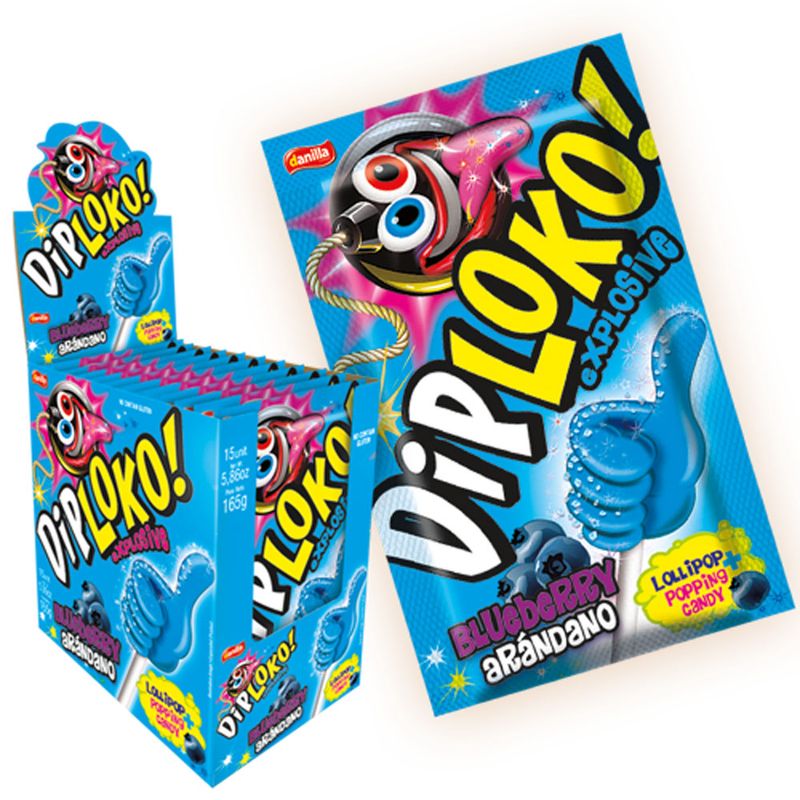 Dip Loko, o pirulito acompanhado de bala explosiva em pó proporcionando uma verdadeira explosão de alegria. Contém 11 unidades de 15g.