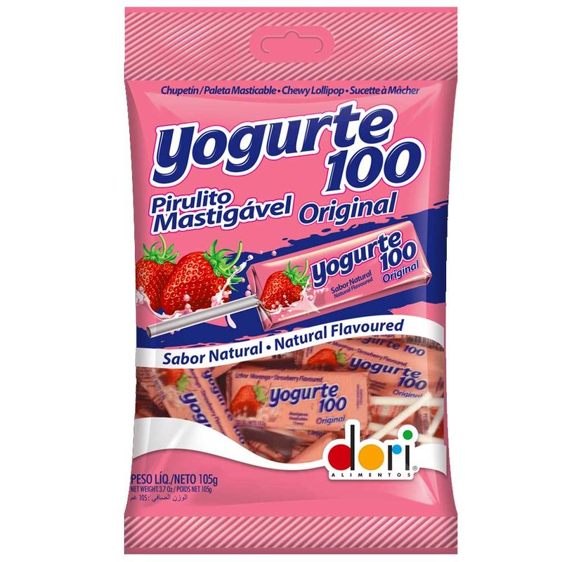 Yogurte 100 o pirulito que é 100% o sabor do iogurte natural. Delicioso pirulito mastigável de iogurte de morango que que é uma delícia