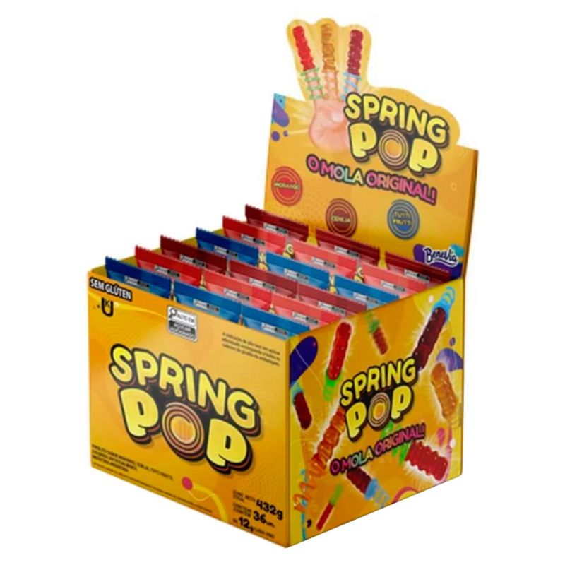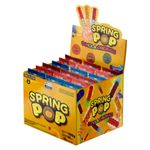 Pirulito de mola Spring Pop. Nos sabores sortidos morango, tutti frutti e cereja, eles vem com uma espiral de mola para você colocar no dedo. Divertido e delicioso! Contém 36 unidades sortidas de 12g cada.