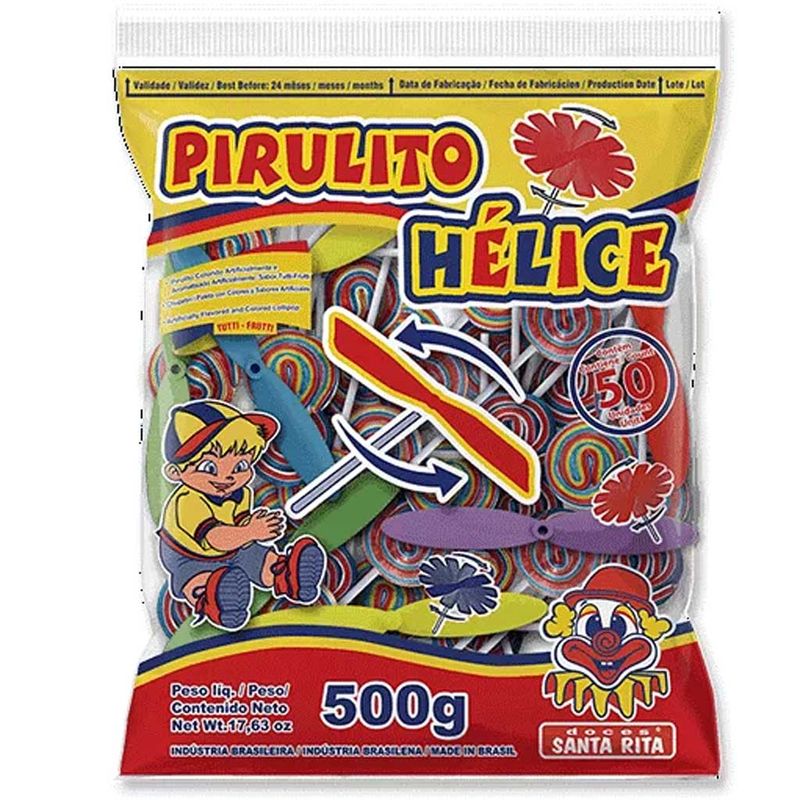 Pirulito Psicodélico com Hélice, após terminar o pirulito é so encaixar a hélice no palitinho, girar e se divertir! Pacote de 500g, com 50 unidades de 10g e 50 hélices.