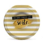 Petisqueira Funda c/8 Ano Novo Sorte. Petisqueira com 18 cm de diametro listrada de dourado e branco e com a frase um ano repleto de Sorte.Composição: Papel cartão, plástico e pigmento colorido.