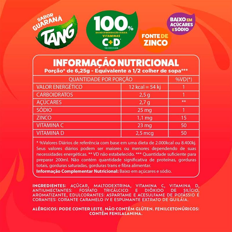 Chegou o novo Tang, com 100% da dose diária de vitamina C e D que o seu filho precisa e ainda é fonte de Zinco. A nova fórmula tem 18g e rende 1L, qualidade e praticidade que deixam o dia a dia mais delicioso. Prepare seu filho para mudar o mundo com Tang Guaraná!