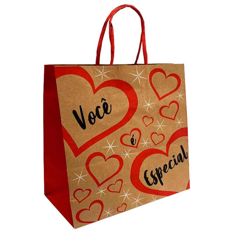 Sacola estampada com corações e a frase você é especial ideal para montar presentes, lembrancinhas ou embalar itens diversos. Material: Papel Kraft. Medidas: 30,5cm x 11,5cm x 30,5cm.Referente a 01 unidade.