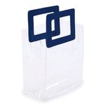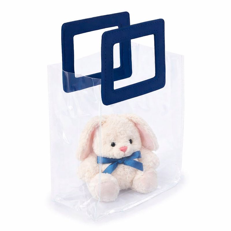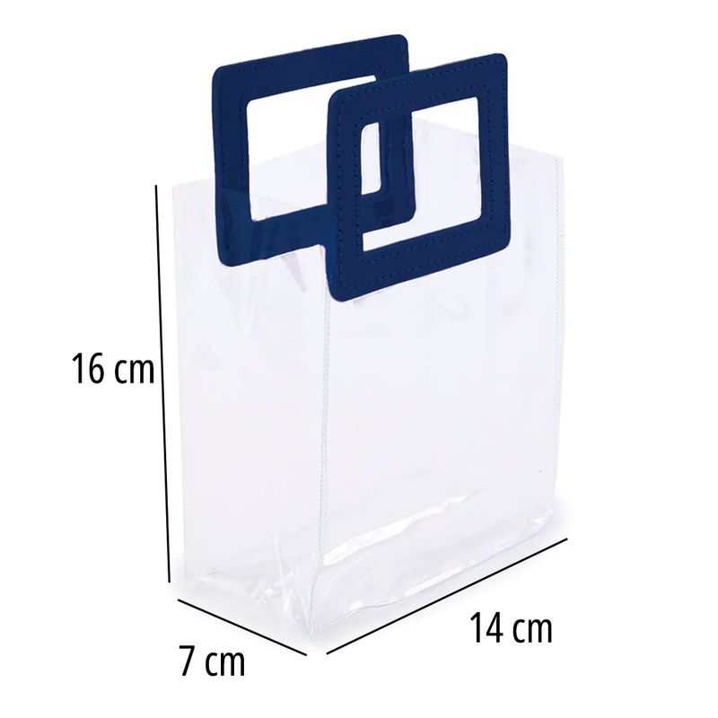Sacola plástica transparente com alça em couro azul-escuro, ideal para presentes e lembrancinhas. Versátil e resistente, oferece um visual sofisticado que valoriza o conteúdo.