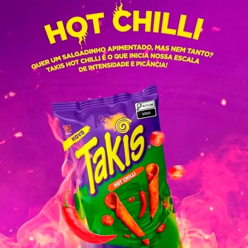 Takis Hot Chilli, o salgadinho de milho sabor carne grelhada picante com especiarias. Uma explosão de sabor! Crocante e saboroso, as tortilhas são enroladinhas e divertidas.