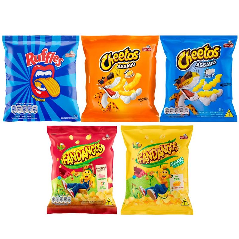 Contém: 1 cheetos lua, 1 cheetos onda, 1 fandangos presunto, 1 fandangos queijo e 1 ruffles original.