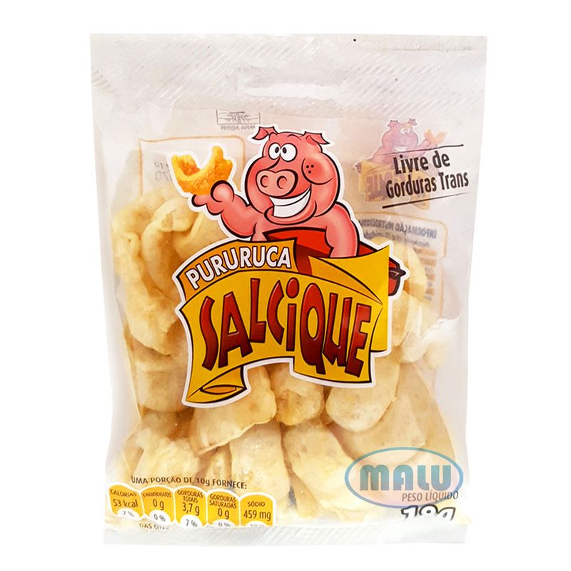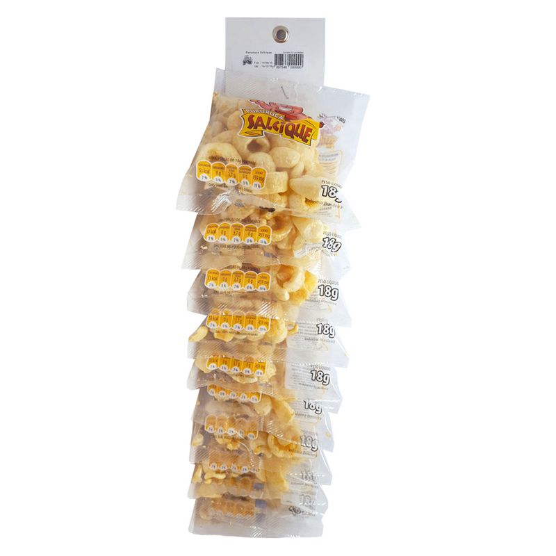 Salcique, a deliciosa pururuca salgada e crocante. Cartela com 10 unidades de 18g cada.