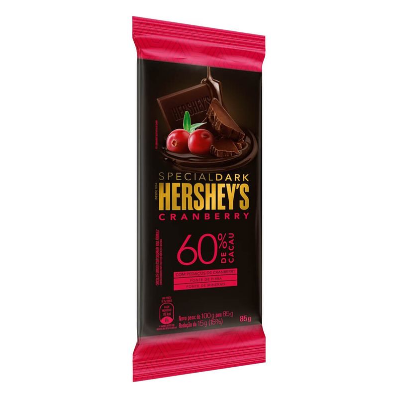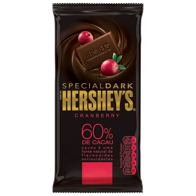 A luxuosa combinação do puro chocolate hersheys com 60% de cacau e cranberry. Tablete de 85g.