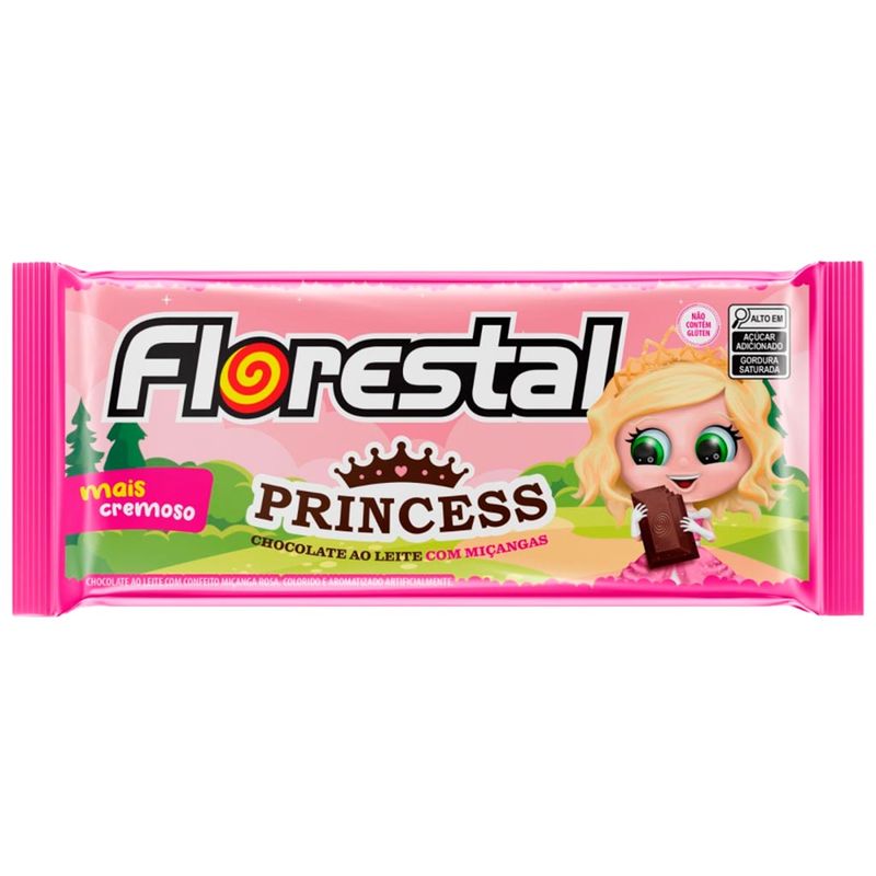 Tablete Princess, produzido com chocolate ao leite cremoso e confeito miçanga rosa. Uma combinação irresistível que transforma cada mordida em pura diversão.