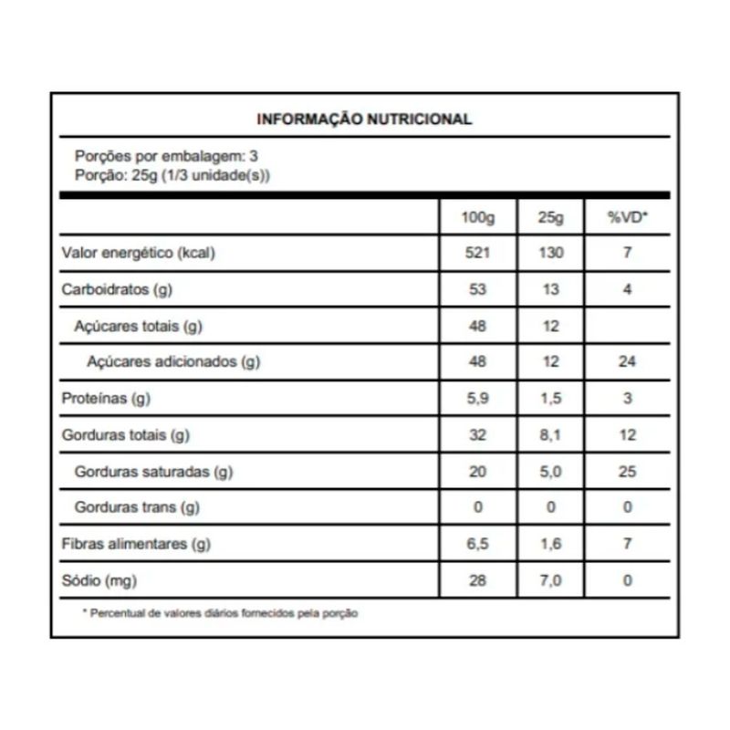 Ingredientes: açúcar, massa de cacau, manteiga de cacau, cacau em pó, emulsificantes lecitina de girassol, ésteres de ácido ricinolêico interesterificados com poliglicerol, aromatizantes e sal. Não contém glúten. Não contém lactose. Pode conter traços de leite, amendoim, amêndoa, avelã, castanha de caju, castanha do pará, nozes e pistache.