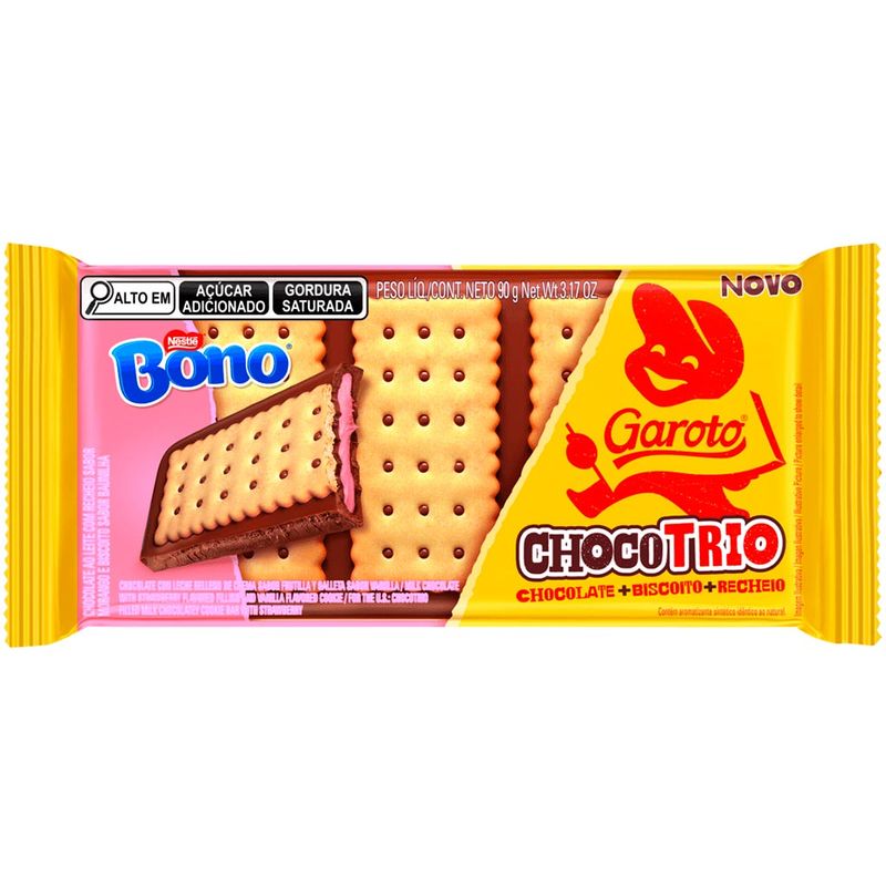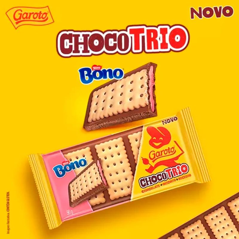 Chocotrio: chocolate + biscoito + recheio. A combinação deliciosa de chocolate ao leite Garoto e biscoito bono com recheio de morango. Crocante e saboroso!