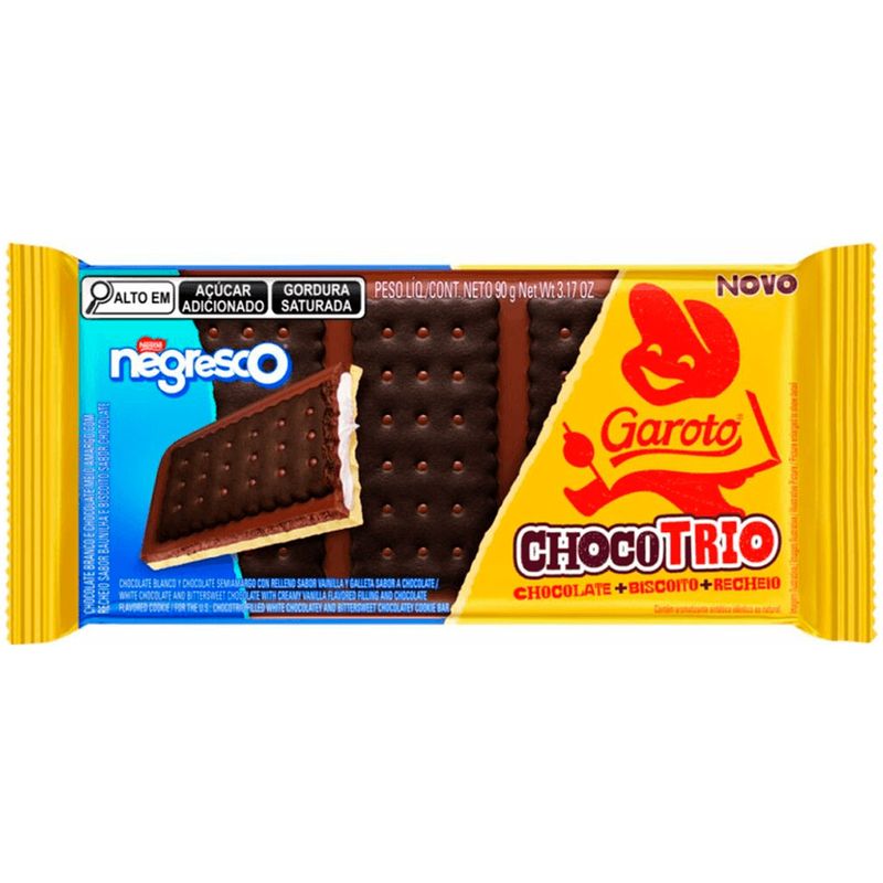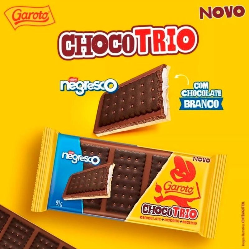 Chocotrio: chocolate + biscoito + recheio. A combinação deliciosa de chocolate amargo e chocolate branco Garoto, biscoito negresco e recheio sabor baunilha. Crocante e saboroso!