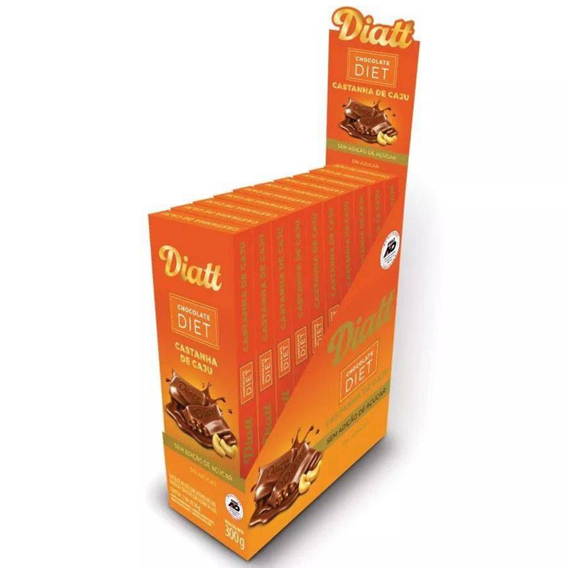Tablete de chocolate ao leite com castanha de caju sem adição de açúcar. Caixa contendo 12 unidades de 25g cada. Pioneira em chocolates Diet no Brasil, a Diatt oferece chocolates Zero e Diet desde 1994. Direcionada para pessoas que buscam alimentos sem adição de açúcar. São produtos com o selo de garantia ANAD (Associação Nacional de Assistência ao Diabético), que traz confiança aos Diabéticos.