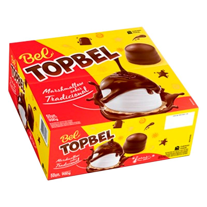 Top Bels, um delicioso doce de marshmallow com cobertura de chocolate. Caixa contendo 50 unidades.