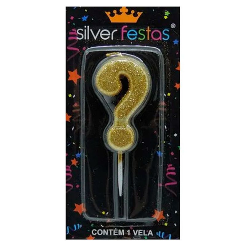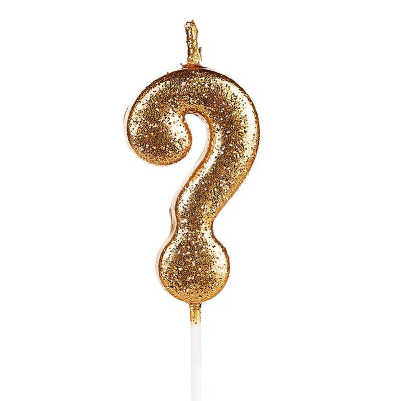 Vela de aniversário interrogação dourada com glitter. Divertida e elegante, vai dar um toque especial à sua festa.